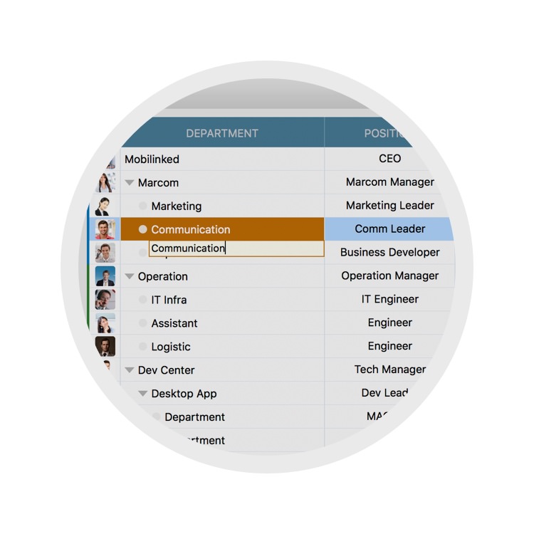 Outline panel maintains department properties as in a grid, with well-designed keyboard shortcuts for cell navigation and editing.