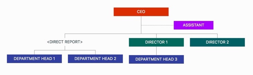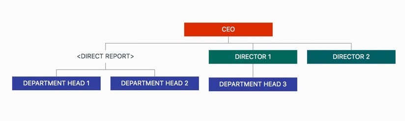 For this case, we can add a virtual department (with different display style) between the CEO and the department heads, as following an example: