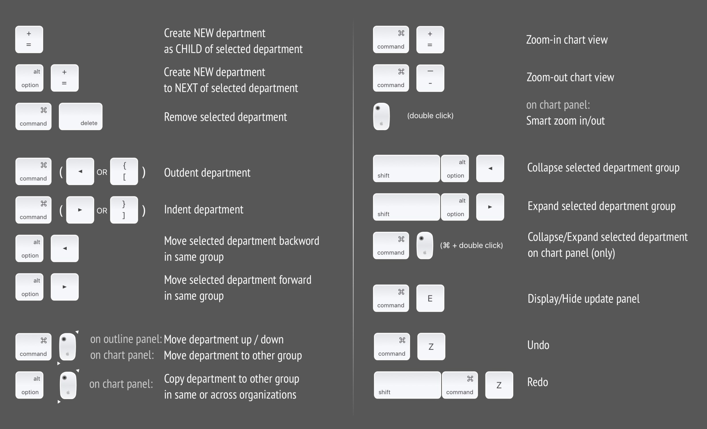 Press ⌘⌥^ (Command + Alt + Ctrl) to show shortcut tips in the active organization chart window.